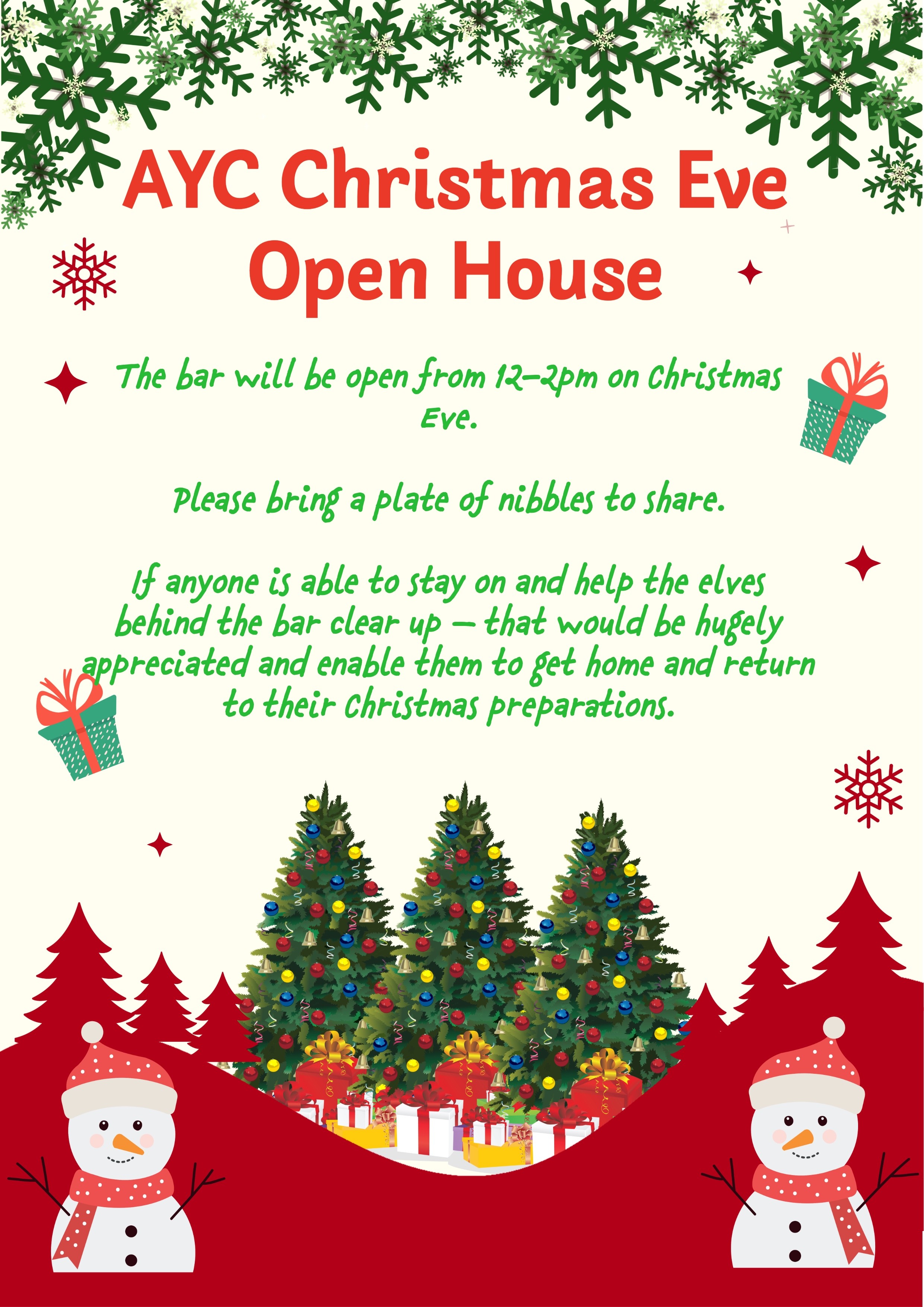 The bar will be open from 12-2pm on Christmas Eve. Please bring a plate of nibbles to share.